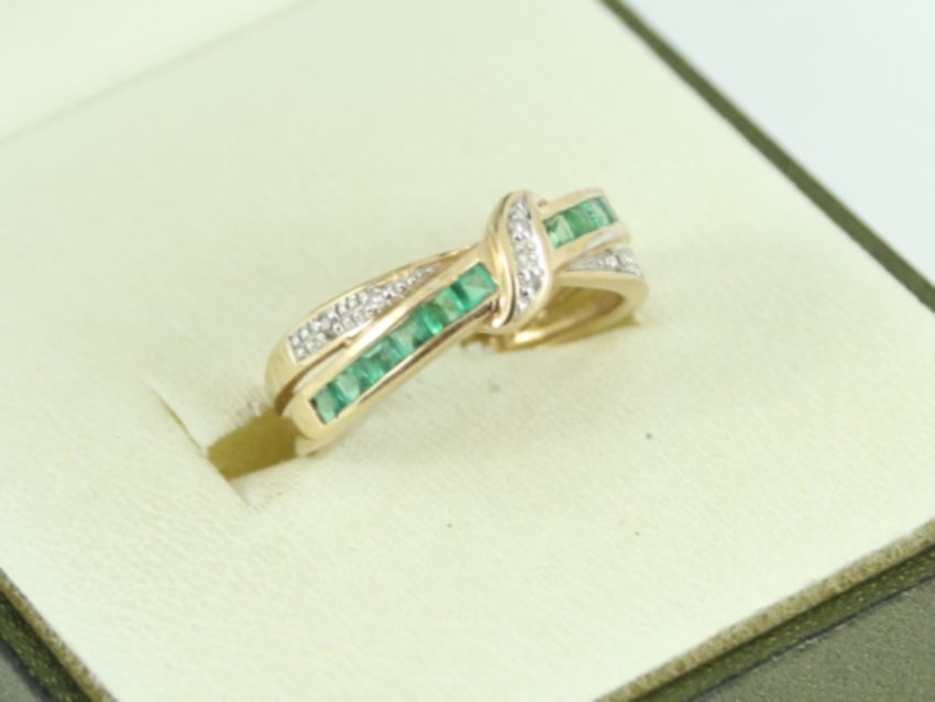 Here for sale, we have this magnificent ladies half eternity crossover ring made from 9ct yellow gold and set with lovely princess cut emeralds and brilliant cut diamonds.