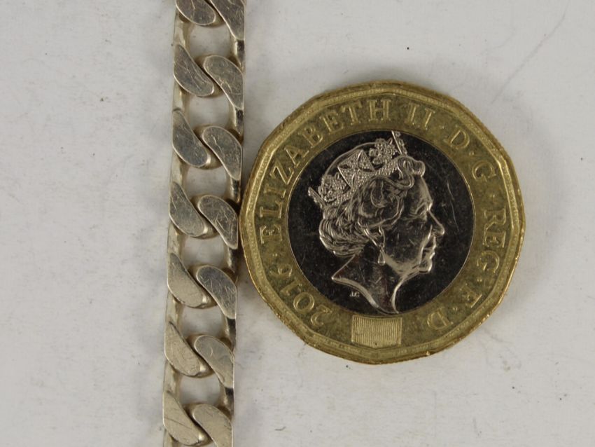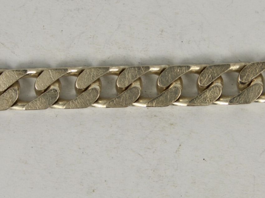 Here for sale, we have this magnificent curb chain bracelet made from sterling silver. Weight: 15.9 grams Length: 8.25 inches Width: 6mm |