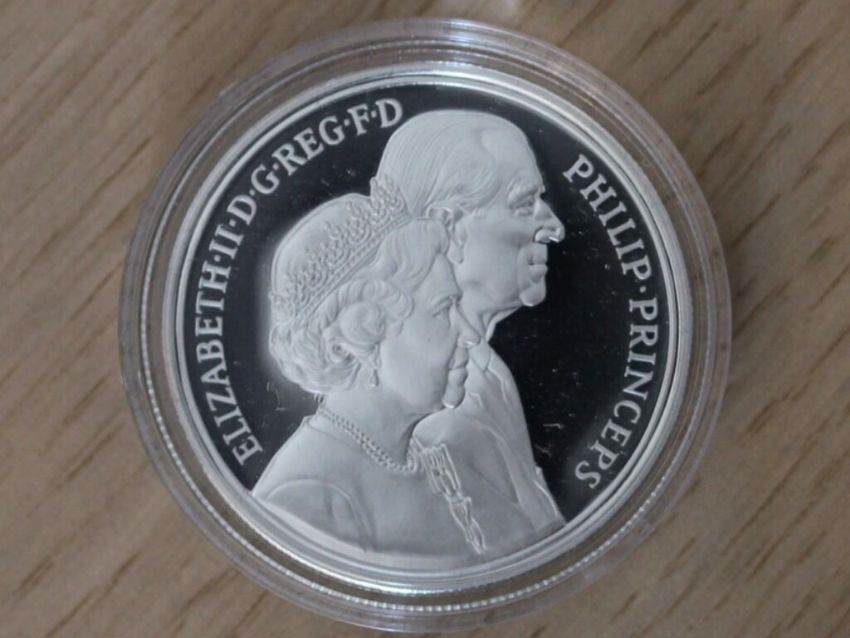 The obverse is a portrait of the royal couple designed by Philip Nathan.