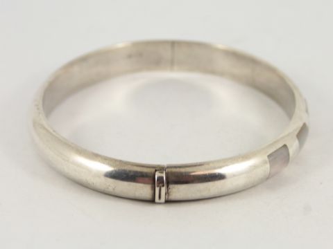 Here for sale we have this beautiful ladies bracelet made from sterling silver and set with lovely pieces of mother of pearl. Weight: 15.4 grams Circumference: 7.25 inches Internal diameters: 59mm x 58mm Width: 10mm Please take a look at our other items for sale. |