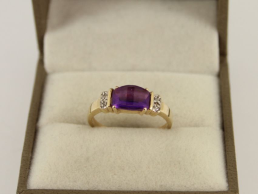 Here for sale, we have this magnificent ladies ring. A gorgeous amethyst stone flanked by two lovely little diamonds set in either shoulder on a 9ct yellow gold shank.