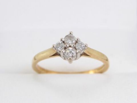 Here we have this gorgeous ladies cluster ring, a cluster of four brilliant cut diamonds weighing a total of 0.25cts claw 18ct gold shank. Size: H 1/2 Weight: 2.2 grams Diamond has been tested 100% authentic |