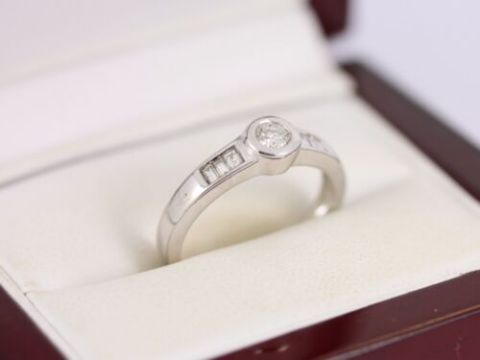 Here for sale we have this magnificent ladies ring a stunning brilliant cut diamond weighing 0.15ct flanked by three baguette cut diamonds channel set in either shoulder on a lovely 18ct white gold shank.