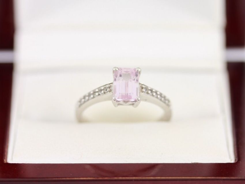 Here for sale we have this beautiful ring, made from sterling silver with a gorgeous style and set with an emerald facet cut morganite flanked by six CZ stones in either shoulder.