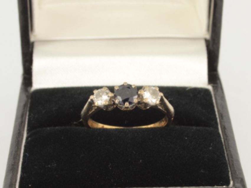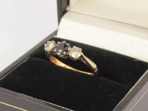 Here for sale, we have this magnificent ladies trilogy ring. A gorgeous circular facet cut sapphire flanked by two brilliant cut diamonds set on a lovely 18ct yellow gold shank.