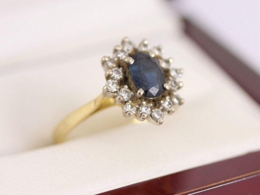Here for sale we have this magnificent ladies halo ring, an oval facet cut sapphire surrounded by sixteen brilliant cut diamonds set on a lovely 18ct yellow gold shank.