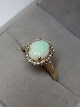 This alluring opal ring would be the ideal gift to present to any lady who loves vintage inspired jewellery. The ring showcases opal to stunning effect with a large oval cut opal which shimmers beautifully within its claw setting surrounded by natural diamonds and completed with the glow of 9K yellow gold.