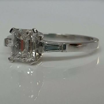 Enjoy the bold styling of mixed diamond cuts in a classic three-stone diamond ring design with this stunning beauty, featuring a dazzling claw set Emerald Cut center stone 1.00 CT flanked on either side by two sparkling 0.19 Baguette Cut diamonds, which are all beautifully held in a stylish bar setting. A timeless design with a modern twist, this unique three-stone diamond ring has been crafted in 18ct white gold. Hallmark:750