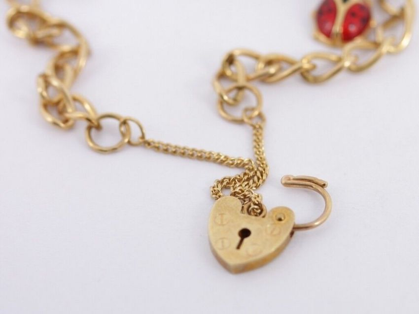 Here for sale we have this magnificent vintage chain bracelet, with a delightful heart locket clasp and a set of keys and ladybird charm, made from 9ct yellow gold.