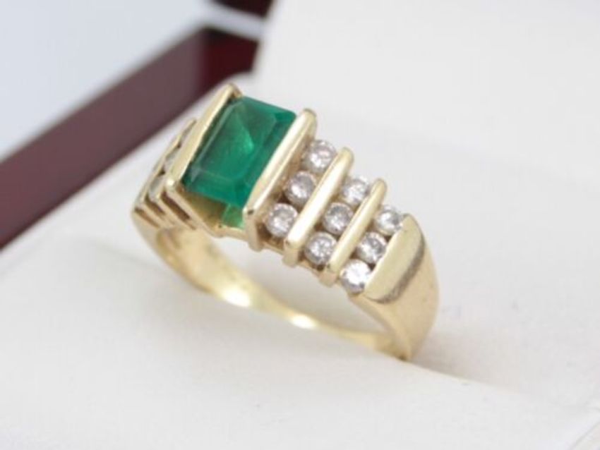 Here for sale we have this gorgeous ladies ring, a gorgeous rectangle cut synthetic emerald flanked nine lovely diamonds channel set in either shoulder on a 14K yellow gold shank. This ring would make an ideal gift for a loved one. Size: L Weight: 5.5 Grams All diamonds are tested, 100% genuine. |