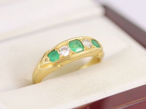 Here for sale we have this magnificent ladies ring, three stunning princess cut emeralds flnked by two gorgeous brilliant cut diamonds set on a lovely 18ct yellow gold shank.