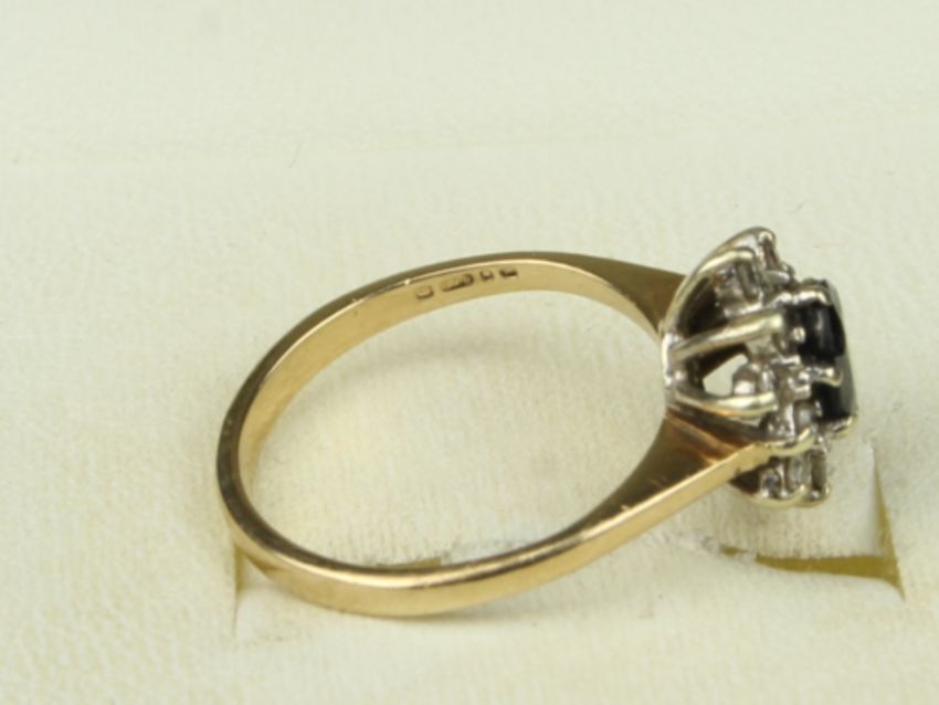 Here for sale, we have this magnificent ladies halo ring. A gorgeous oval facet cut sapphire surrounded by twelve brilliant cut diamonds set on a lovely 9ct yellow gold shank.