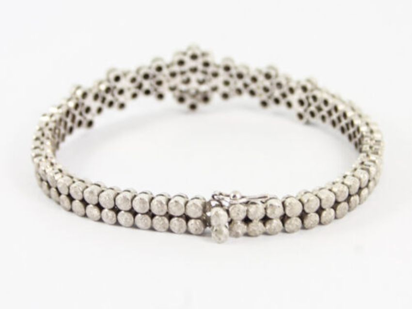 Here for sale, we have this absolutely stunning ladies bracelet beautifully crafted from 18ct white gold and set with twenty-six brilliant cut diamonds weighing a total of approx 1ct. Weight: 27.6 grams Length: 6.5 inches Width: 15mm tapering down to 6mm Please see our other lovely items for sale. |