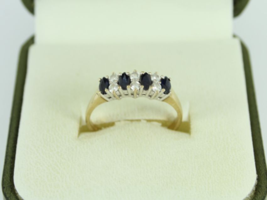 Here for sale, we have this magnificent ladies ring. Four stunning marquise cut sapphires flanked by six CZ stones set on a lovely 9ct yellow gold shank.