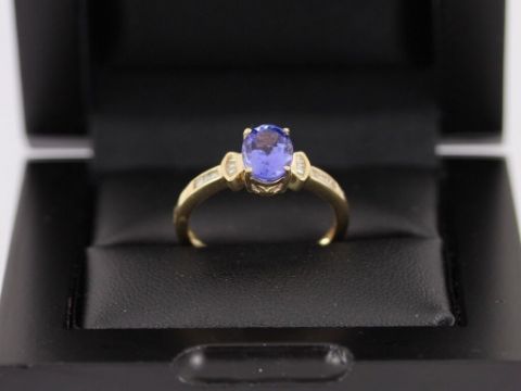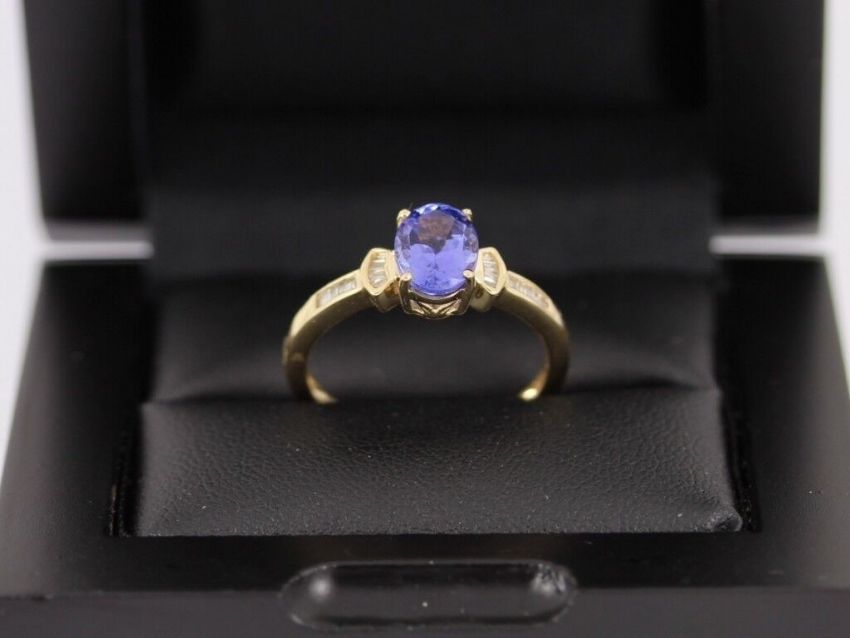 Here for sale we have this gorgeous ladies ring, a stunning oval facet cut tanzanite weighing 1.85ct flanked by sixteen baguette cut diamonds weighing a total of 0.15ct set on a lovely 9ct yellow gold shank.