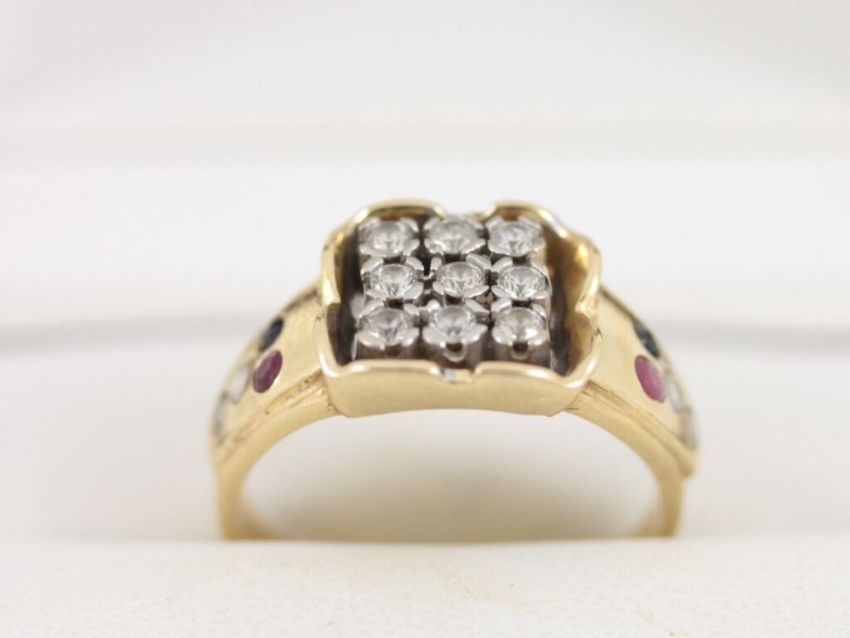 Here for sale we have this magnificent ladies signet ring, the head is set with nine beautiful cz stones flanked by two CZs and a synthetic ruby and syntetic sapphire in either shoulder set on a lovely 14k yellow gold shank.