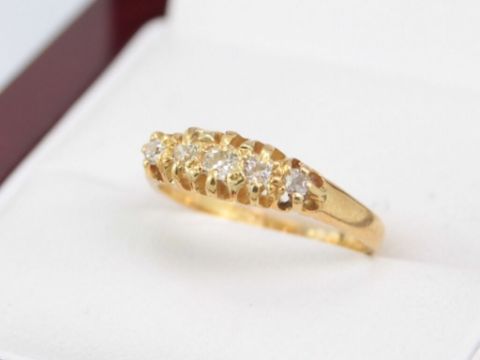 | Stunning five stone diamond ring, the graduated brilliant and eight-cut diamonds weighing a total of 0.25ct in open work mount with scrolling shoulders, engraved dedication to 18ct yellow gold shank. Size: L Weight: 2.8 grams Diamonds have been tested 100% authentic. |