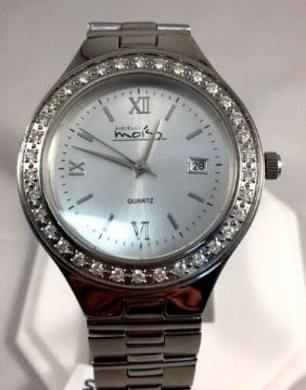 A gorgeous 1ct Moissanite  bezel watch with a stainless steel strap.  A beautiful silver face watch with numeric numbers.  Face size  2" in width
