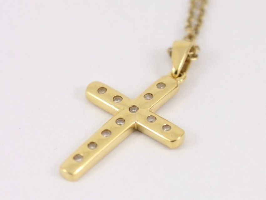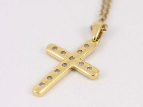 Here for sale we have this gorgeous ladies cross pendant, made from 18ct yellow gold and set with eleven beautiful brilliant cut diamonds weighing a total of 0.15ct on a lovely 9ct yellow gold chain necklace.