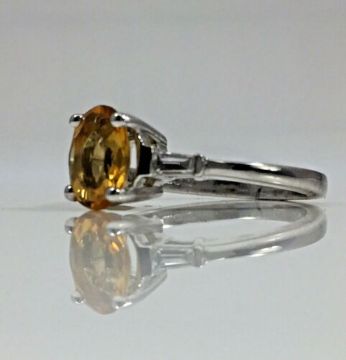 This wonderful Citrine Ring features a large Oval cut yellow Citrine with two natural baguette white diamonds on each side.