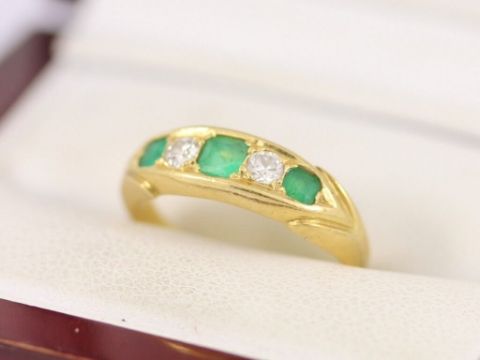 Here for sale we have this magnificent ladies ring, three stunning princess cut emeralds flnked by two gorgeous brilliant cut diamonds set on a lovely 18ct yellow gold shank.