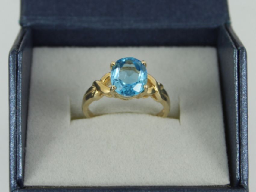 Here for sale, we have this magnificent ladies ring. A gorgeous oval facet cut Swiss Blue Topaz set in a lovely 9ct yellow gold shank