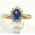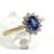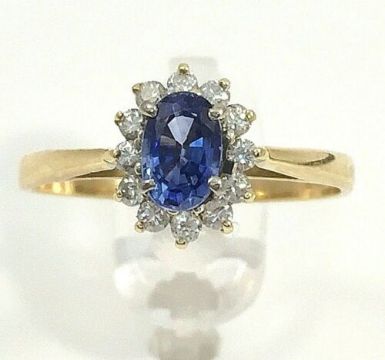 A classic yellow gold cluster ring featuring an oval 0.50ct Blue topaz at the centre and a cluster of sparkling diamonds set  around the edge (25pts  diamond weight approx).
