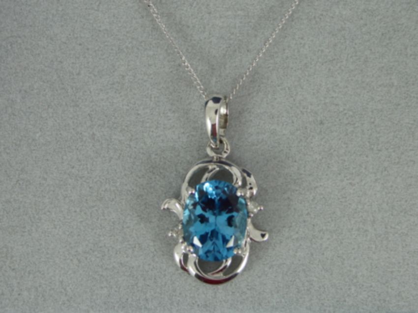 Here for sale, we have this magnificent ladies pendant and necklace. Made from 9ct white gold and set with a lovely Swiss blue topaz measuring 10mm x 8mm (2.52ct) flanked by two brilliant cut diamonds weighing a total of 0.03ct.