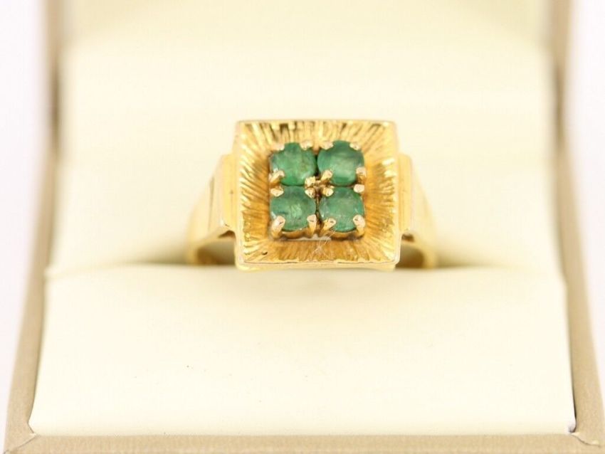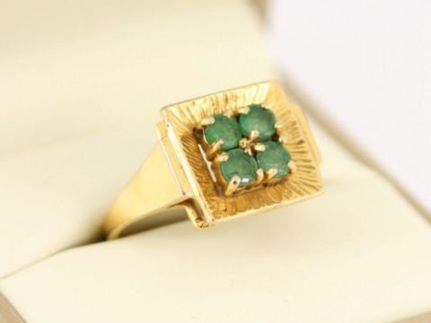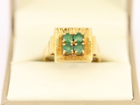 Here for sale we have this gorgeous ladies ring, four stunning circular facet cut emeralds set on a lovely 9ct yellow gold shank.