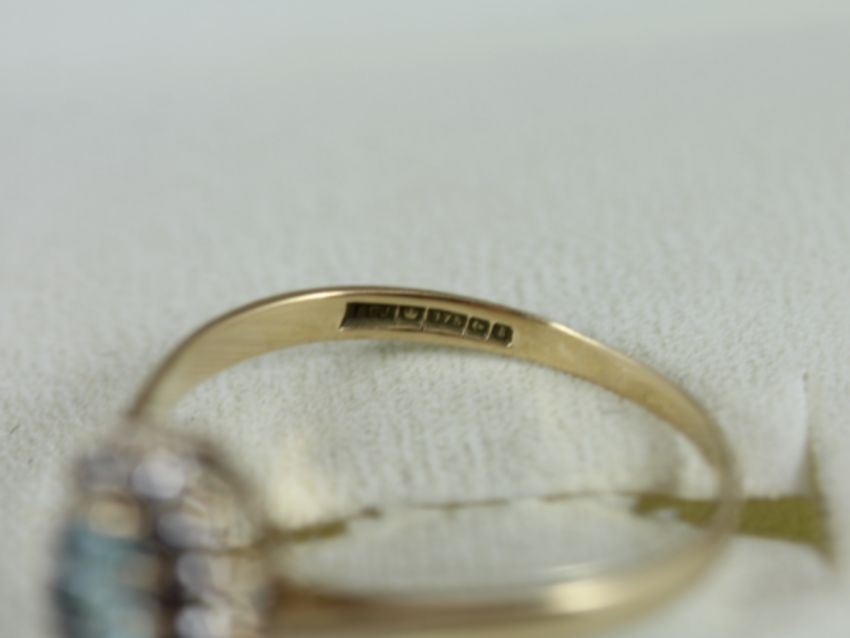 Here for sale, we have this magnificent ladies halo ring. A gorgeous sky blue topaz stone surrounded by twelve CZ stones set on a lovely 9ct yellow gold shank.