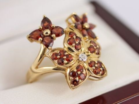 Here for sale we have this magnificent ladies cluster ring, beautiful synthetic garnets set in a floral design flanked by a delightful diamonds on a lovely 10K yellow gold shank.
