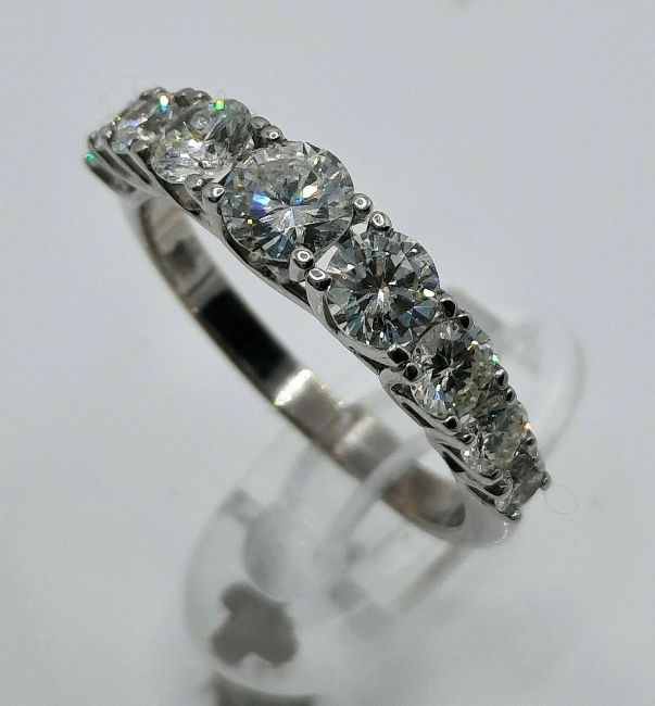 This exquisite Eternity Ring features nine dazzling 1.32-carat total weight Brilliant Cut Diamonds, each supported by an elegant four-claw setting. The delicate claws elegantly support the diamonds, whilst their dewy shine perfectly complements the dazzling sparkle of the jewels.