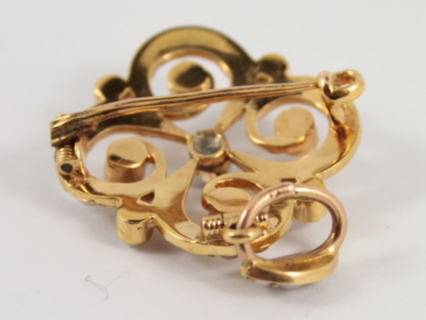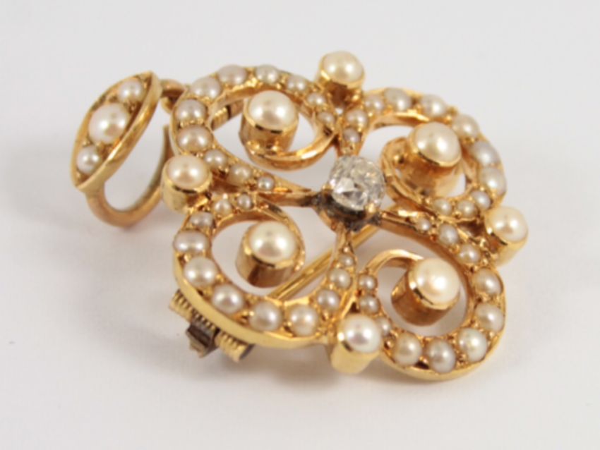 Here for sale we have this beautiful antique brooch/pendant made from 18ct yellow gold set with seed pearls and a gorgeous old cut diamond in the centre weighing approx 0.20ct Measures: 35mm x 25mm (including bale) Weight: 6 grams Please take a look at our other items for sale |