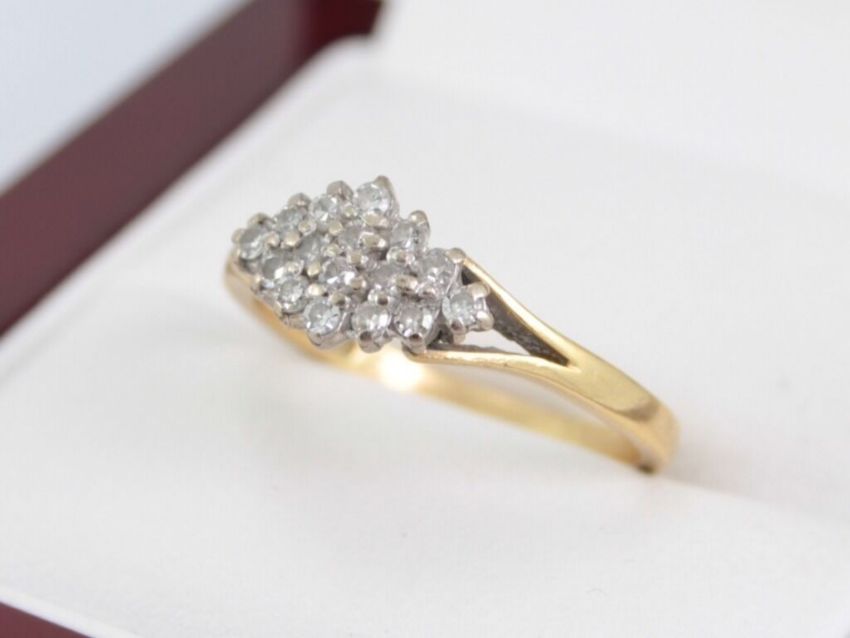 Here we have this gorgeous ladies cluster ring, a clustered head of sixteen brilliant cut diamonds weighing a total of 0.25 carats claw set on an 18ct yellow gold shank. Size: P Weight: 3.6 grams Head measures: 12mm x 7mm Head height: 5mm Shank width: 2mm Diamonds have been tested 100% authentic |