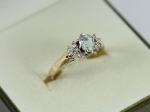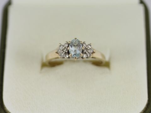 Here for sale, we have this magnificent ladies ring. A gorgeous oval facet cut sky blue topaz stone flanked by six diamonds on either side set on a lovely 9ct yellow gold shank.