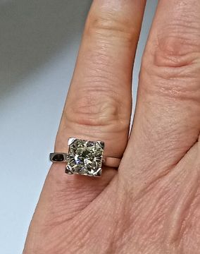 an exquisite 3ct princess cut diamond ring in white gold with a heavy four-claw thick shank, with a color grade of L and clarity grade of VS2. The princess cut diamond is known for its brilliance and fire, and at 3 carats, this diamond is a substantial and impressive size. The white gold setting provides a classic and timeless look that complements the diamond perfectly, while the thick shank adds weight and durability to the ring. The L color grade indicates a faint yellow tint, which can add warmth and character to the diamond. The VS2 clarity grade means that there may be some inclusions or blemishes visible under 10x magnification, but they are not visible to the naked eye, which makes this diamond a great value. This statement piece is sure to turn heads and be a cherished heirloom for years to come. Congratulations on owning such a stunning ring!