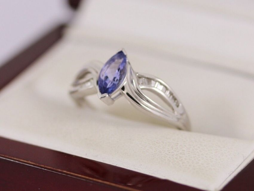 Here for sale we have this magnificent ladies ring, a gorgeous marquise cut tanzanite flanked by twelve baguette cut diamonds set in either shoulder on a lovely 9ct white gold shank.