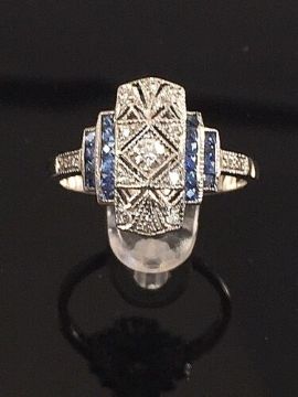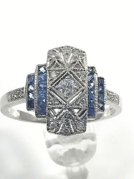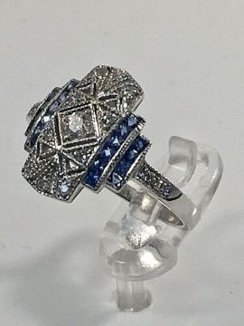 Art nouveau style dress ring. This unusual dress ring is in white gold and has ornate filigree art work holding 11 natural diamonds. Beautiful pale blue sapphires in two block on each side of the ring.