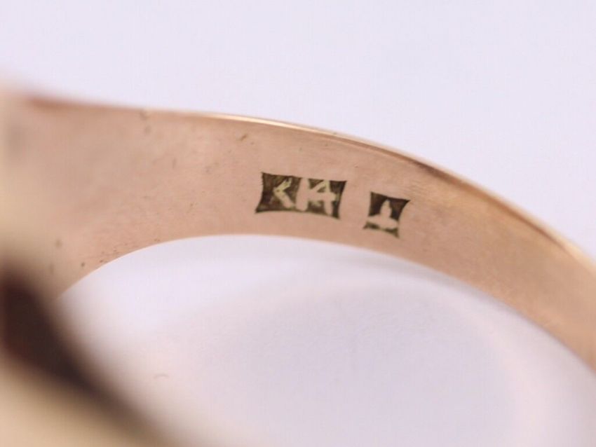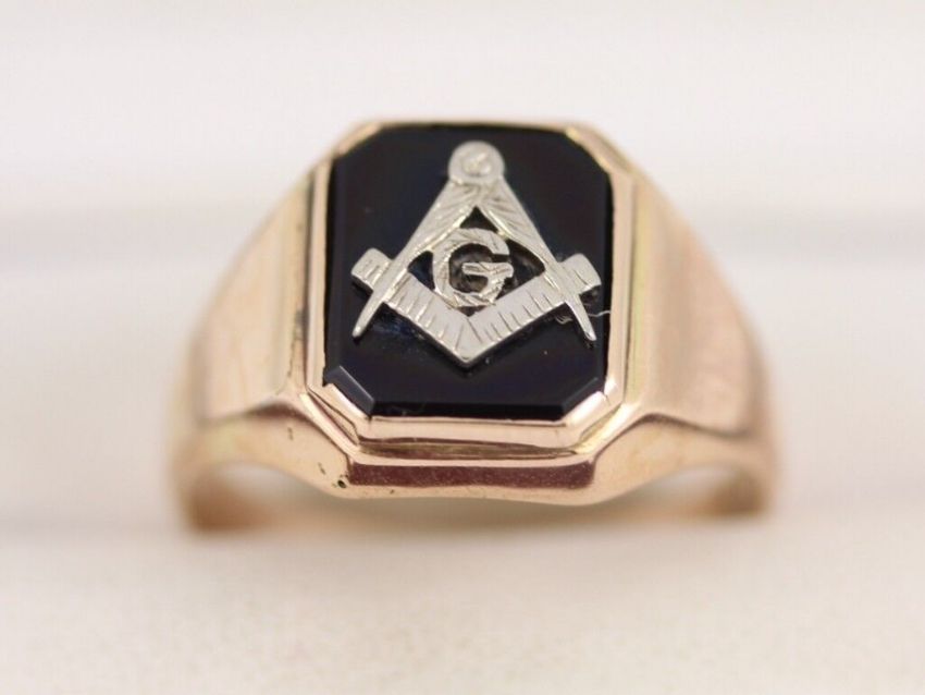 Here for sale we have this magnificent gents masonic signet ring, made from light rose tinted 14k gold with an onyx head with a masonic motif.