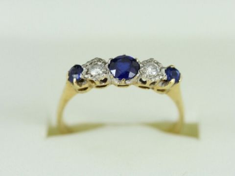 Here for sale we have this magnificent ladies ring, three beautiful circular facet cut sapphires separated by two brilliant cut diamonds weighing a total of 0.10ct set on a lovely 18ct yellow gold shank.