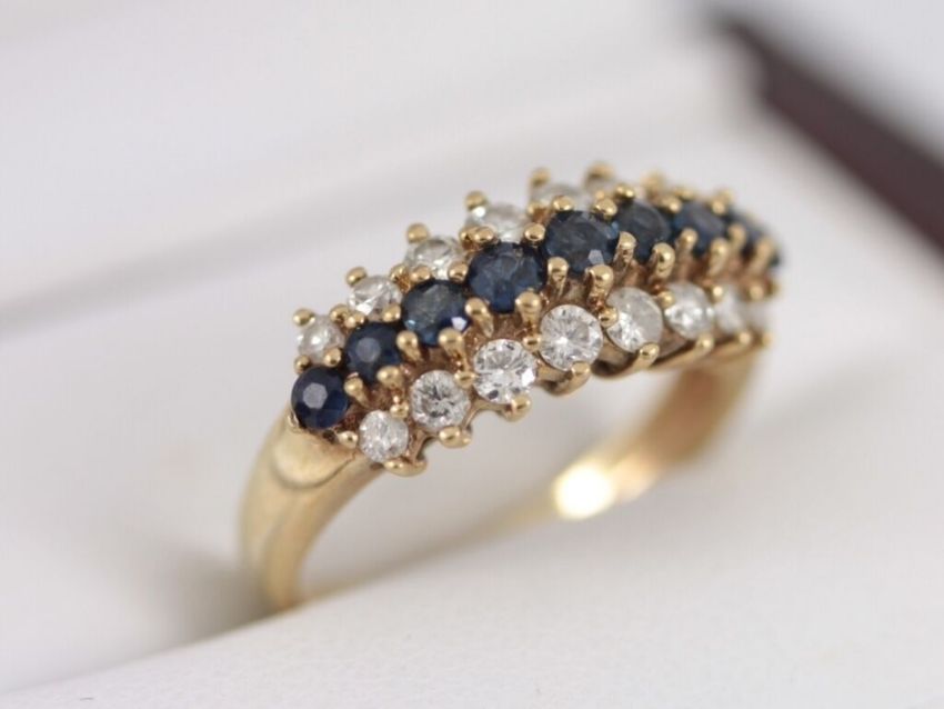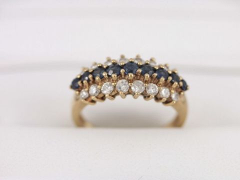 Here for sale we have this magnificent ladies diamond and sapphire ring, nine gorgeous circular facet cut sapphires flanked by two rows of stunning brilliant cut sapphires each containing eight diamonds set on a lovely 9ct yellow gold shank.