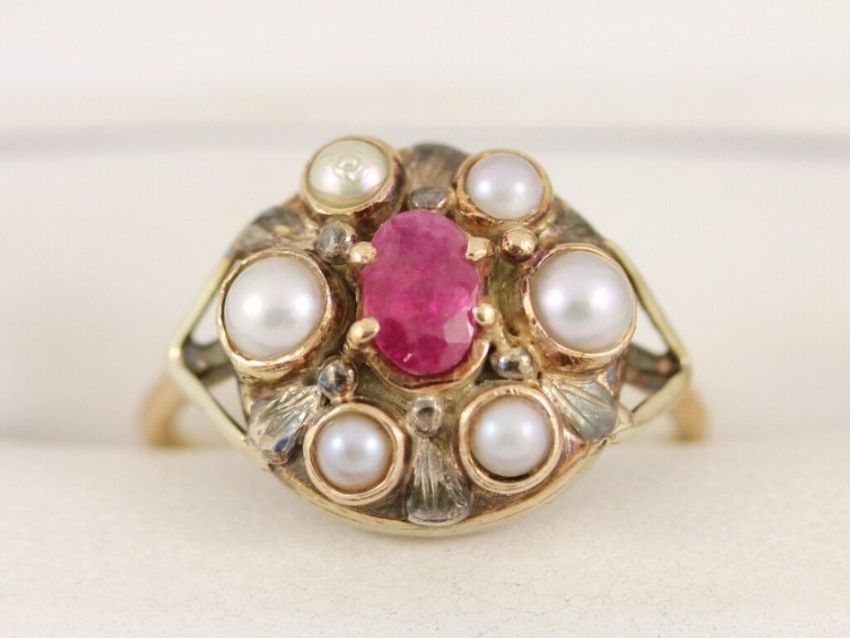 Here for sale we have this magnificent ladies cluster ring, a gorgeous oval facet cut ruby surrounded by lovely pearls set on a 9ct yellow gold shank.