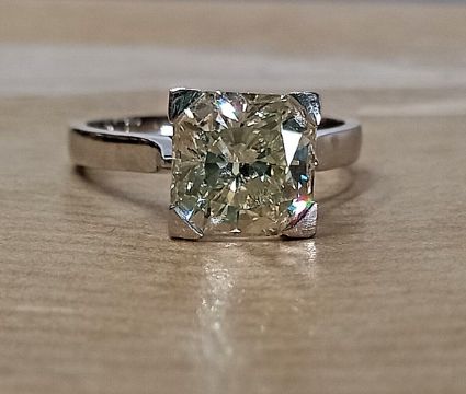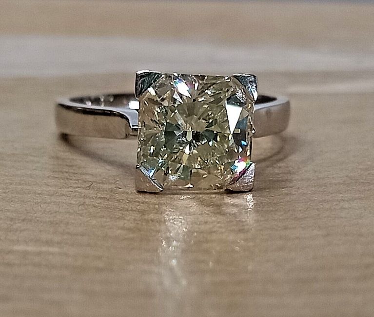 an exquisite 3ct princess cut diamond ring in white gold with a heavy four-claw thick shank, with a color grade of L and clarity grade of VS2. The princess cut diamond is known for its brilliance and fire, and at 3 carats, this diamond is a substantial and impressive size. The white gold setting provides a classic and timeless look that complements the diamond perfectly, while the thick shank adds weight and durability to the ring. The L color grade indicates a faint yellow tint, which can add warmth and character to the diamond. The VS2 clarity grade means that there may be some inclusions or blemishes visible under 10x magnification, but they are not visible to the naked eye, which makes this diamond a great value. This statement piece is sure to turn heads and be a cherished heirloom for years to come. Congratulations on owning such a stunning ring!