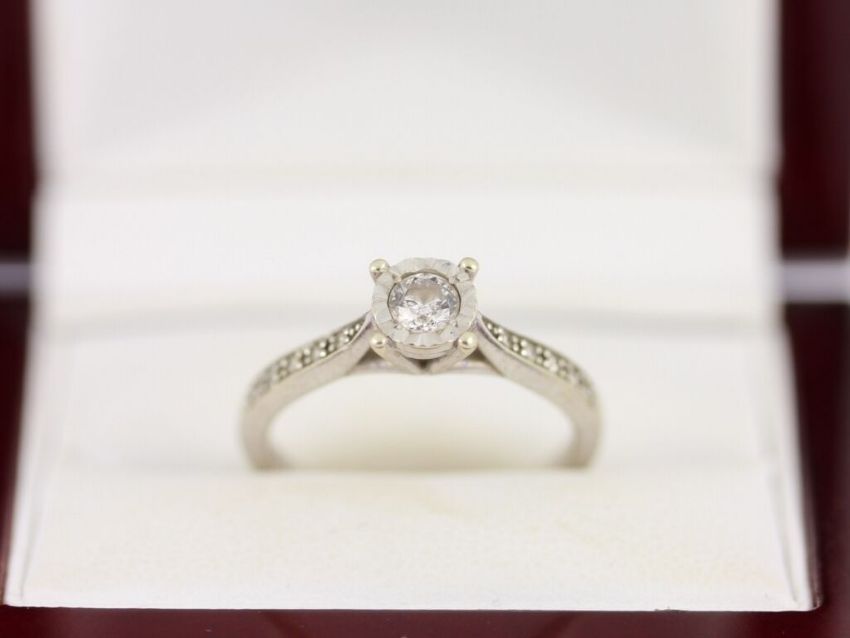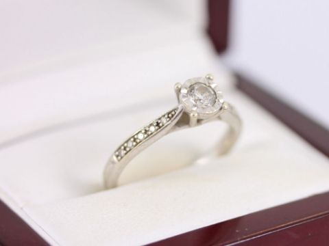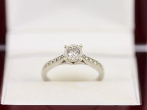 Here for sale we have this magnificent ladies solitaire ring, a gorgeous brilliant cut diamond flanked by five diamonds in either shoulder weighing a total of 0.33ct set in a lovely 9ct white gold shank.