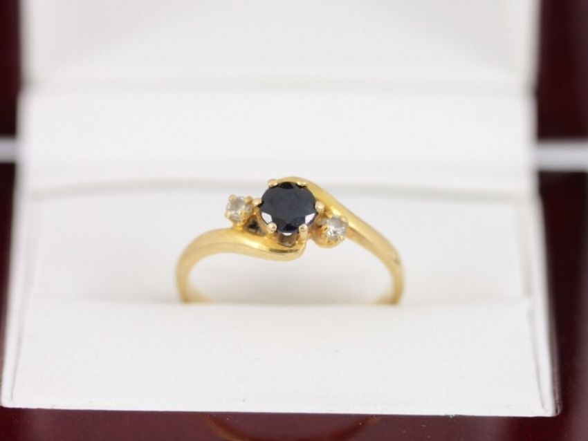 Here for sale we have this magnificent ladies ring, a stunning synthetic sapphire flanked by two lovely cz stones on a crossover mount set on an 18ct yellow gold shank.