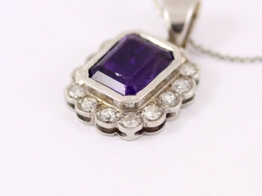 Here for sale we have this beautiful ladies pendant and necklace, a gorgeous emerald facet cut amethyst surrounded by fourteen brilliant cut diamonds weighing a total of approx 0.60ct set on a lovely 9ct white gold pendant on a 9ct white gold chain necklace.