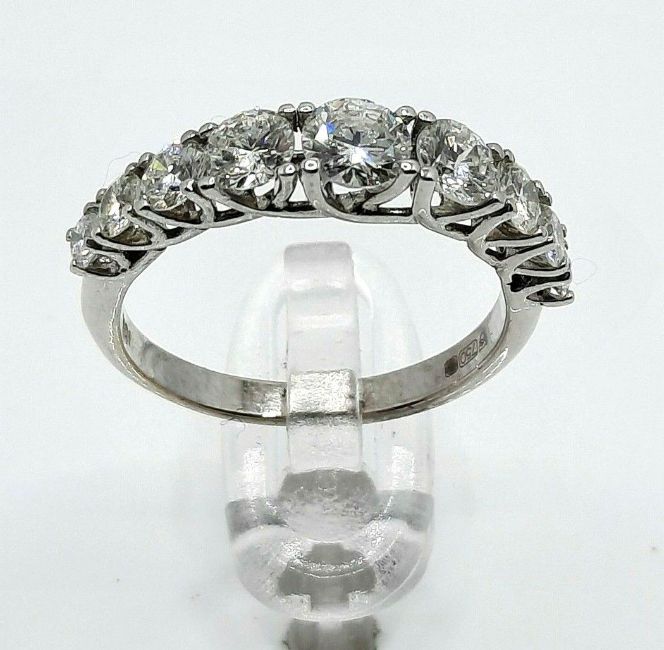 This exquisite Eternity Ring features nine dazzling 1.32-carat total weight Brilliant Cut Diamonds, each supported by an elegant four-claw setting. The delicate claws elegantly support the diamonds, whilst their dewy shine perfectly complements the dazzling sparkle of the jewels.