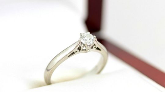 | A brilliant cut solitaire diamond weighing approx 33pts in crown mount with chenier shoulders, on an 18ct white gold shank. Size: K Weight: 4.5 grams Gorgeous ring with a clean and sharp stone. (Tested 100% authentic) |