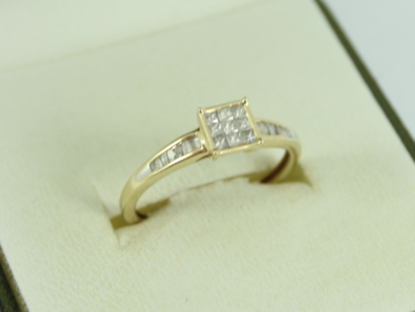Here for sale, we have this magnificent ladies cluster ring. Nine princess cut diamonds set in the head flanked by seven baguette cuts diamonds set in either shoulder on a lovely 9ct yellow gold shank.