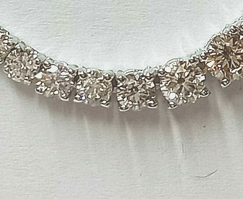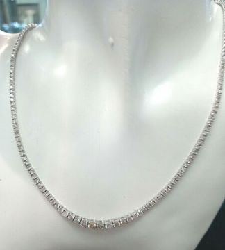 A superbly crafted 18ct white gold graduated 3\4 way diamond tennis collorette featuring 87 natural diamonds. The diamonds range in size and colour. It has a 18ct white gold clasp secured by a figure 8 catch